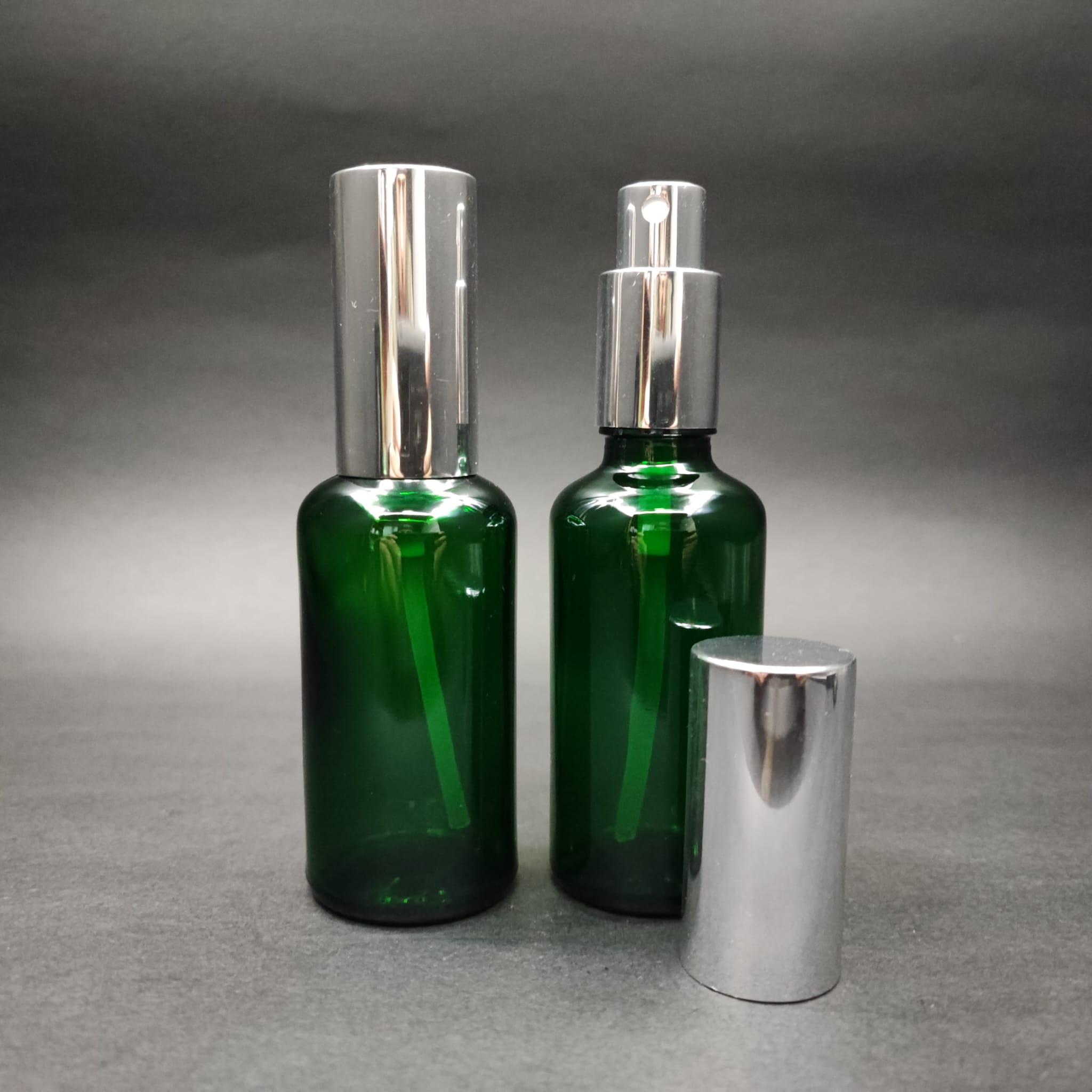50 ML LÜKS VİDALI VALF ÇEVİRME PARFÜM ŞİŞELERİ - 50 CC YEŞİL CAM ŞİŞE - GÜMÜŞ METAL SPREYLİ KAPAKLI SET - 88 adet
