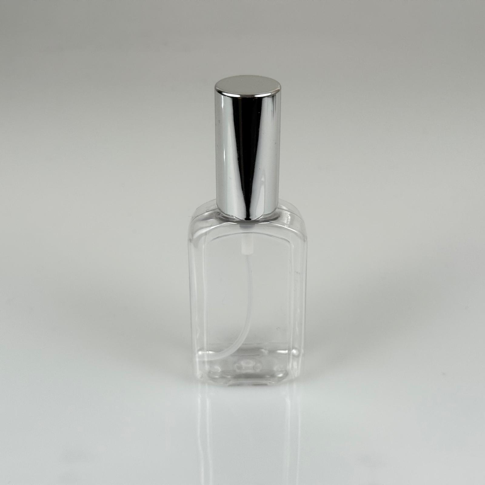 50 ML PET KOLONYA, PARFÜM VB ŞİŞELERİ - METAL ALÜMİNYUM GÜMÜŞ KAPAK + VİDALI SPREY + 50 CC KÖŞELİ YASSI ŞİŞE SET TAKIM - 1000 adet