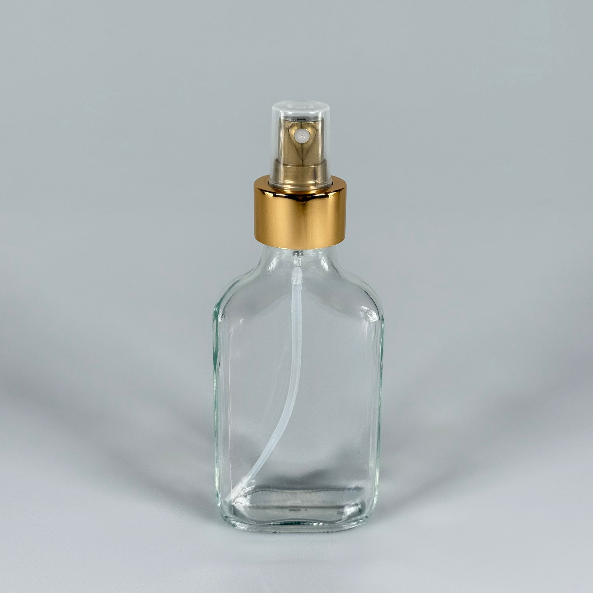 100 CC YASSI ŞEFFAF GOLD SPREYLİ CAM ŞİŞE - 100 ML LÜKS SPREY ŞİŞE - 240 adet